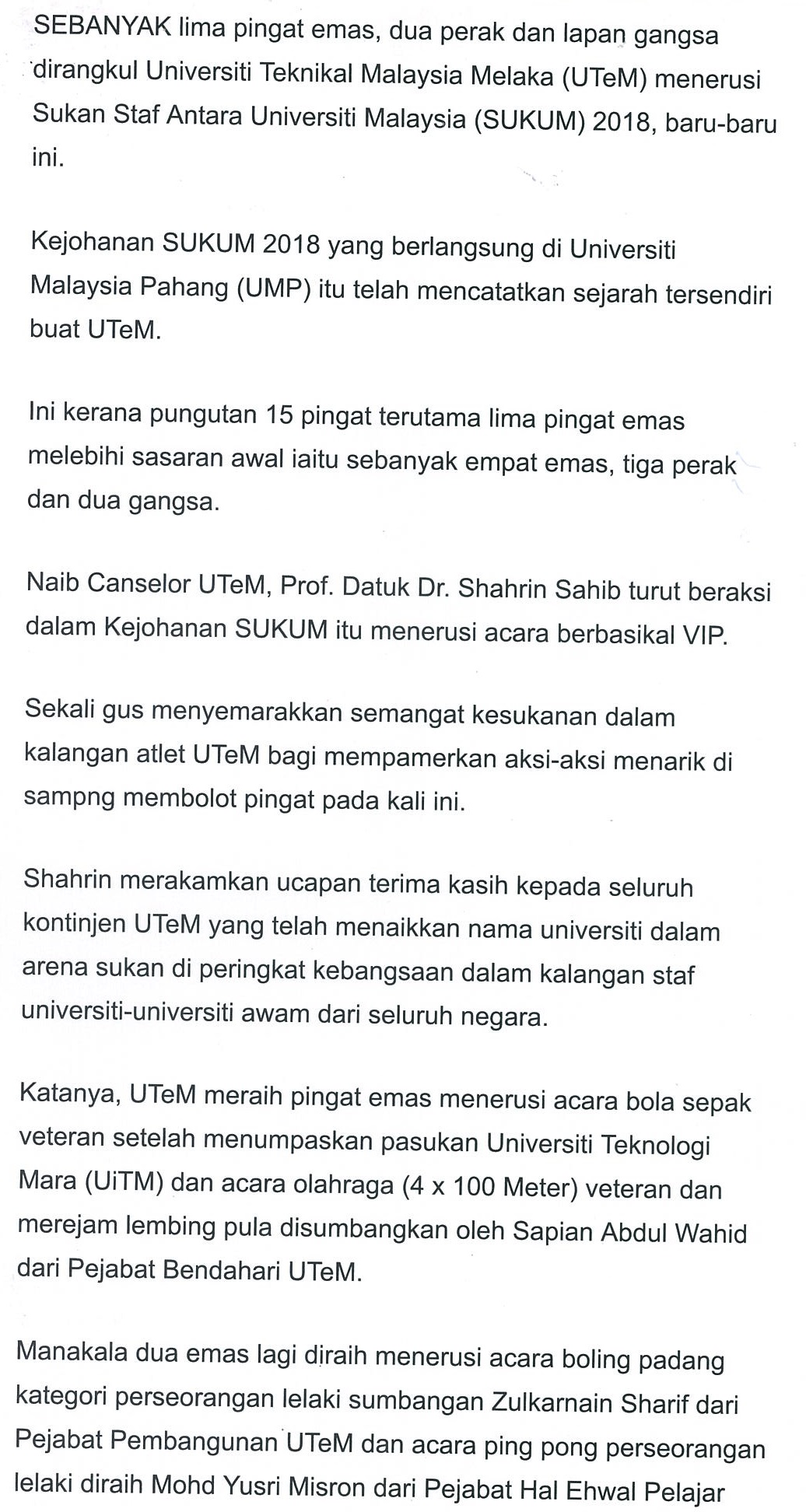 SUKUM 2018 : 15pingat termasuk 5 emas diraih UTeM (part2)