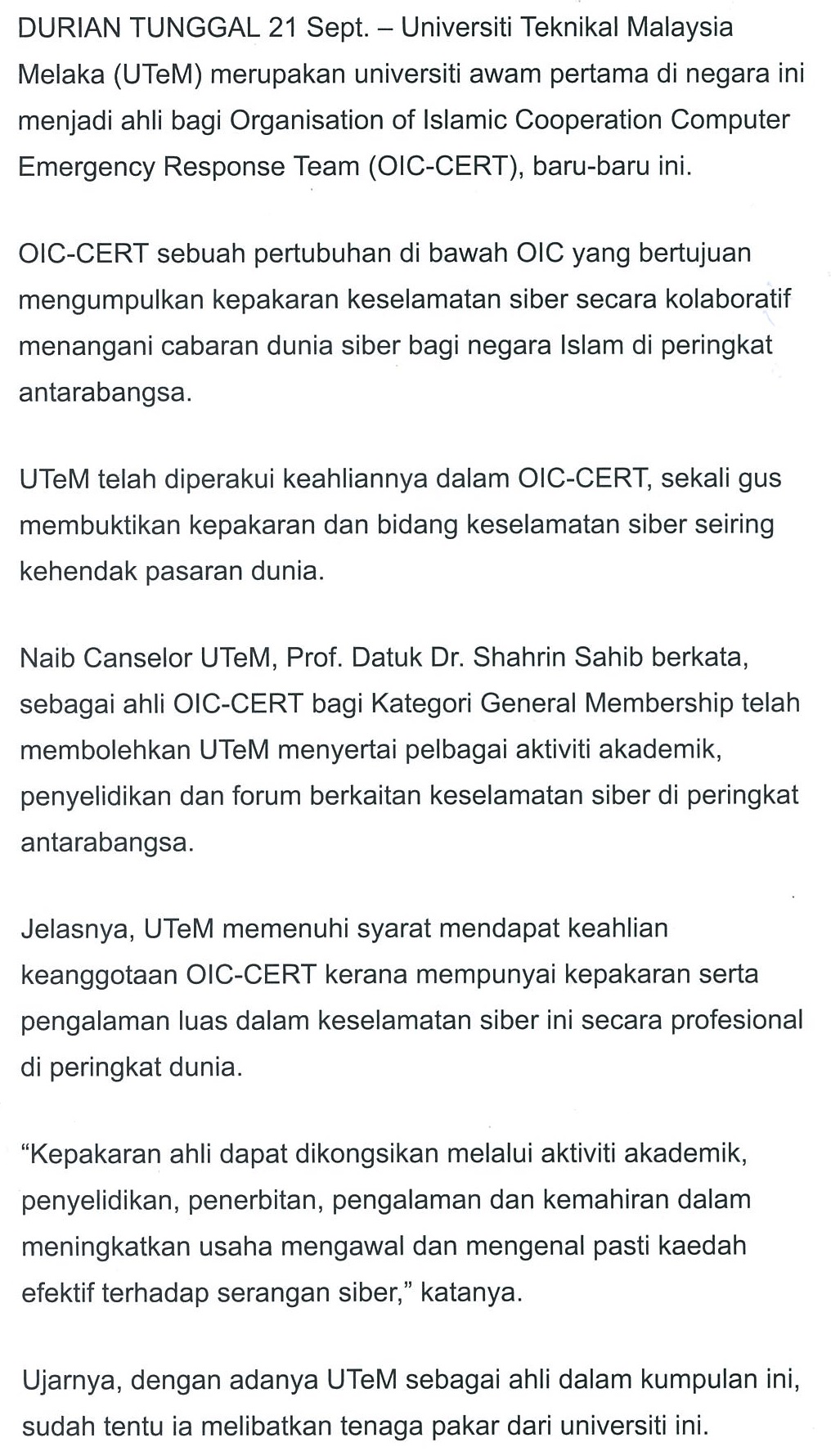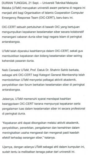 UTeM unievrsiti awam pertama jadi ahli OIC CERT (part2)