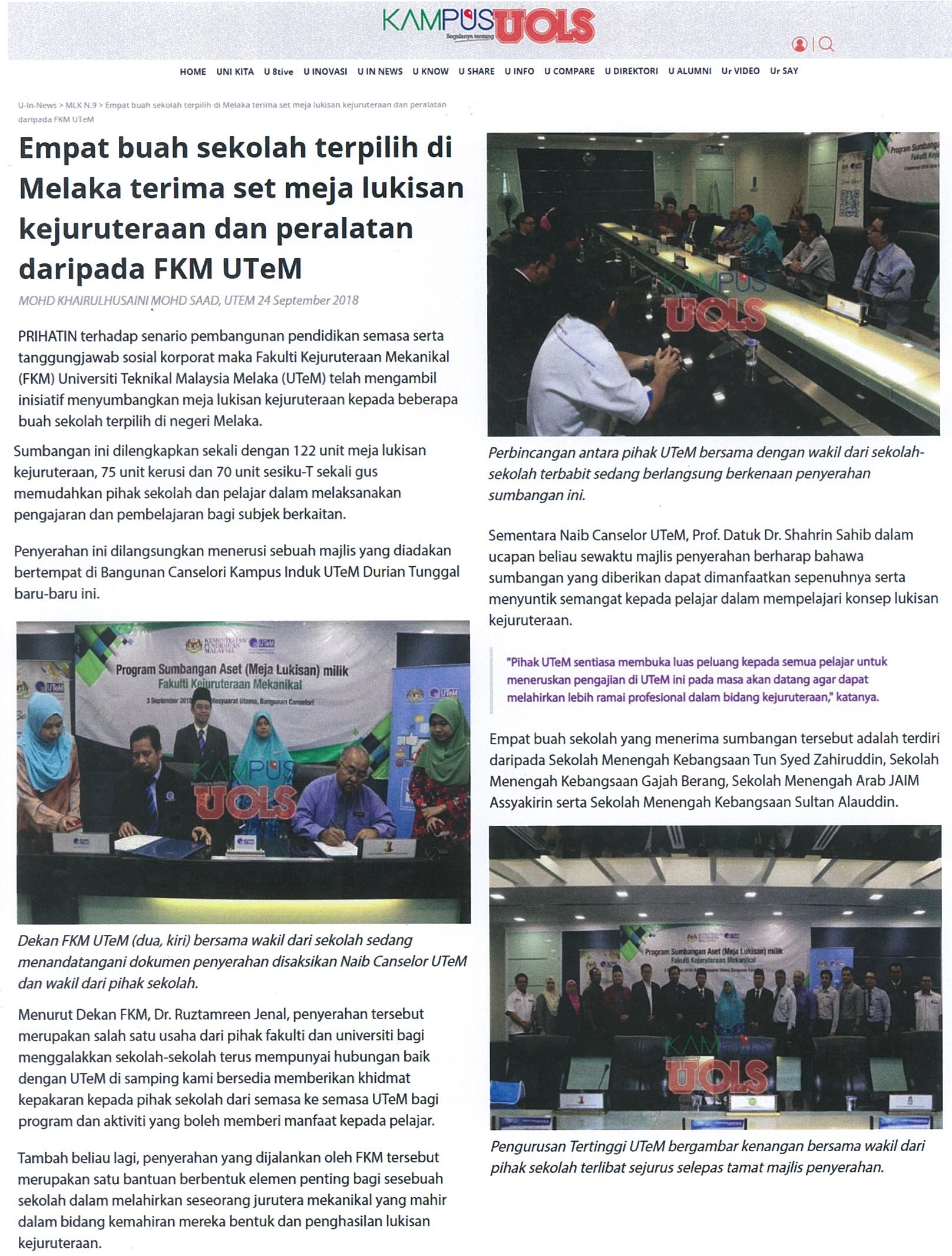 Empat buah sekolah terpilih di Melaka terima set meja lukisan kejuruteraan dan peralatan daripada FKM UTeM