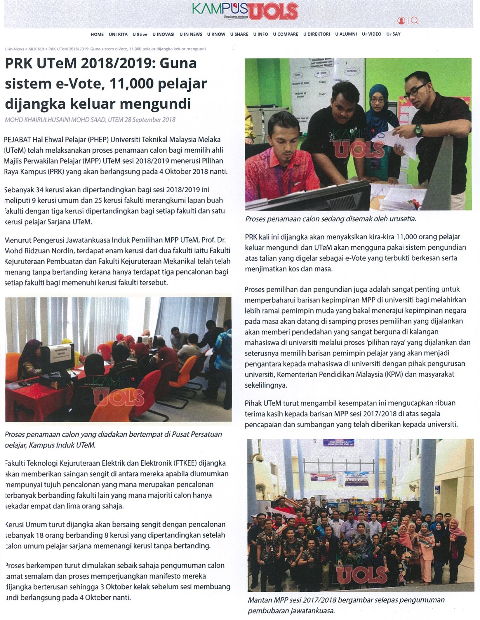 PRK UTeM 2018/2019 : sistem e-Vote, 11,000 pelajar dijangka keluar mengundi