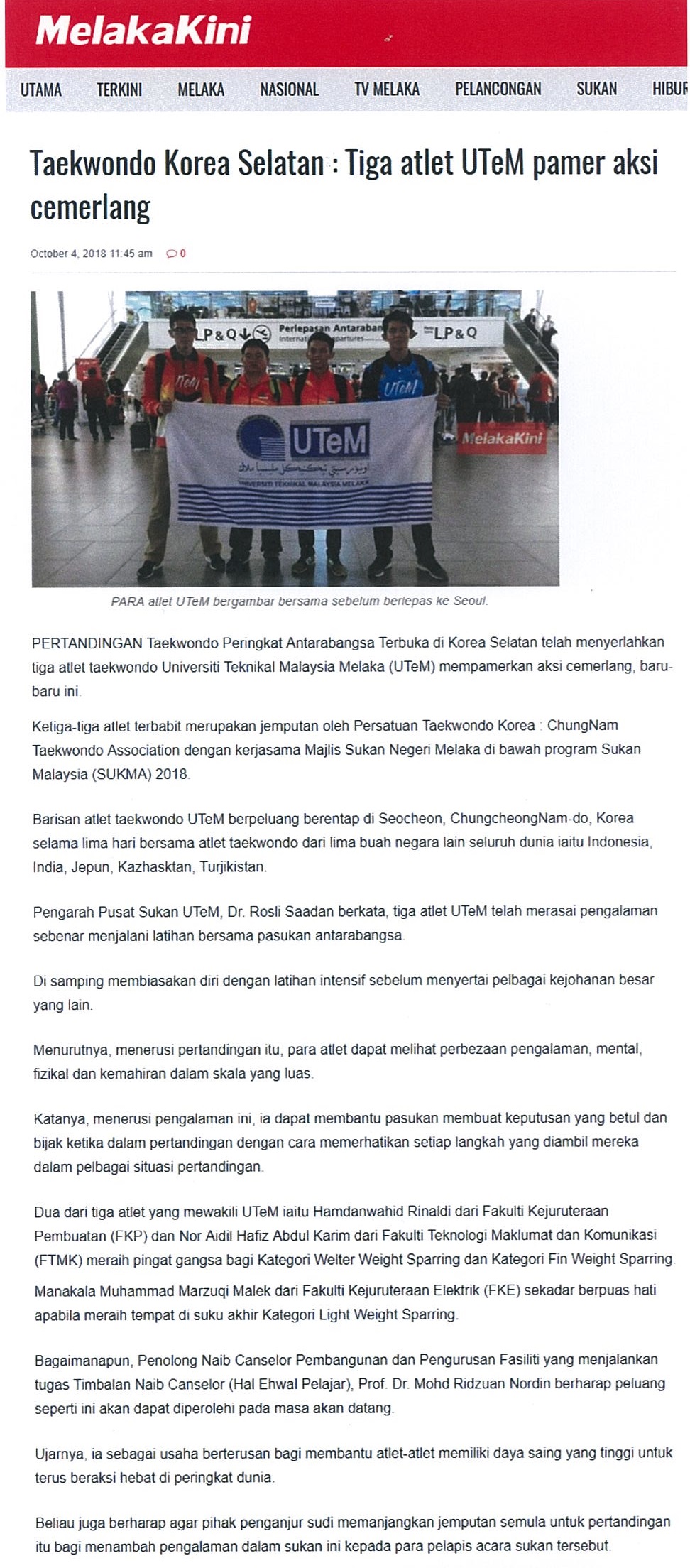 Taekwando Korea Selatan : Tiga atlet UTeM pamer aksi cemerlang