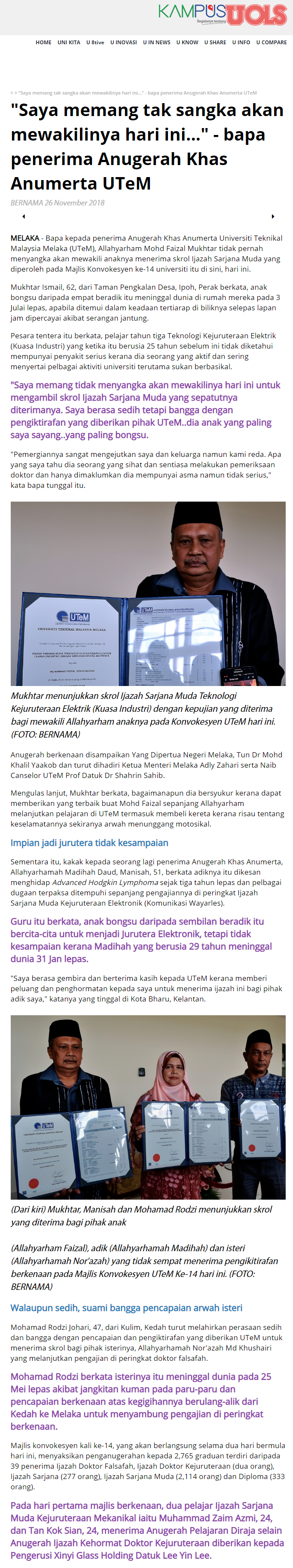 "Saya memang tak sangka akan mewakilinya hari ini..."- Bapa Penerima Anugerah Khas Anumerta UTeM