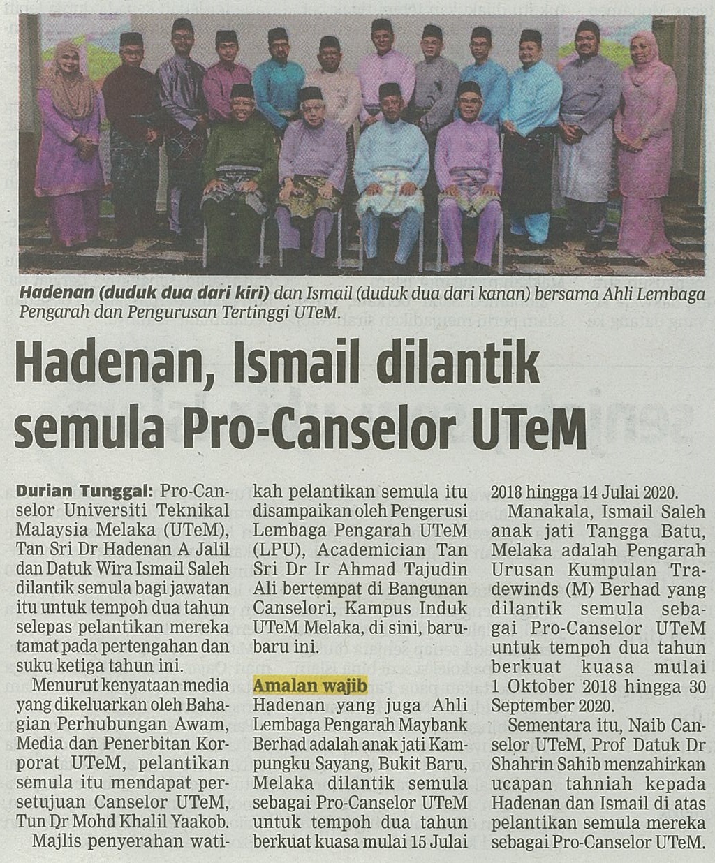 Hadenan, Ismail dilantik semula Pro-Canselor UTeM