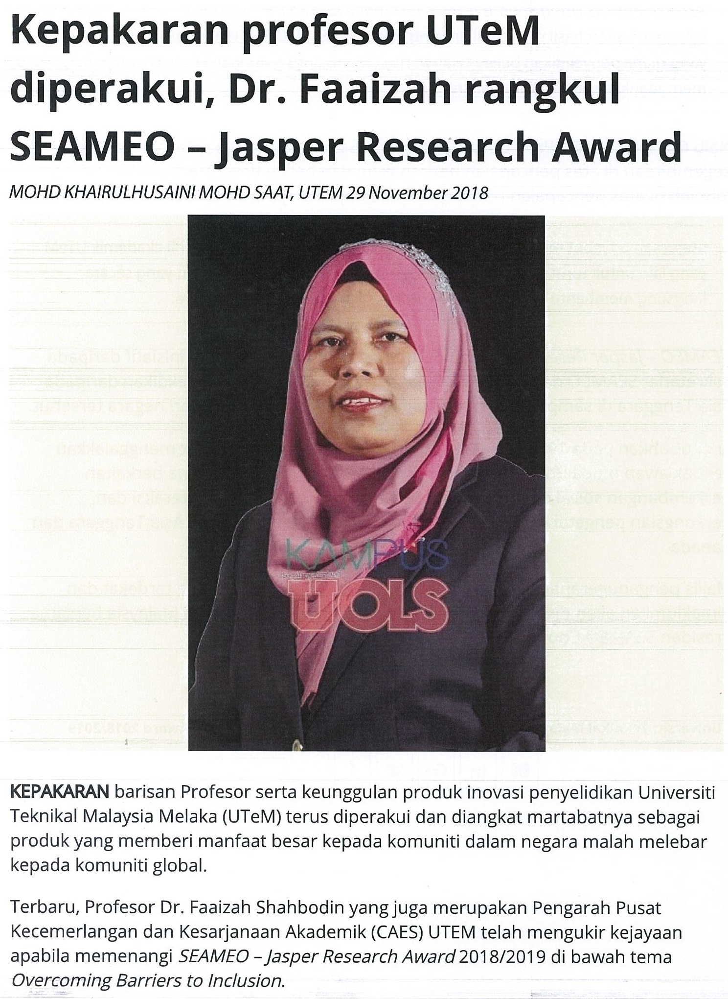 Kepakaran profesor UTeM diperakui, Dr. Faaizah rangkul SAEMEO - Jasper Research Award (part1)