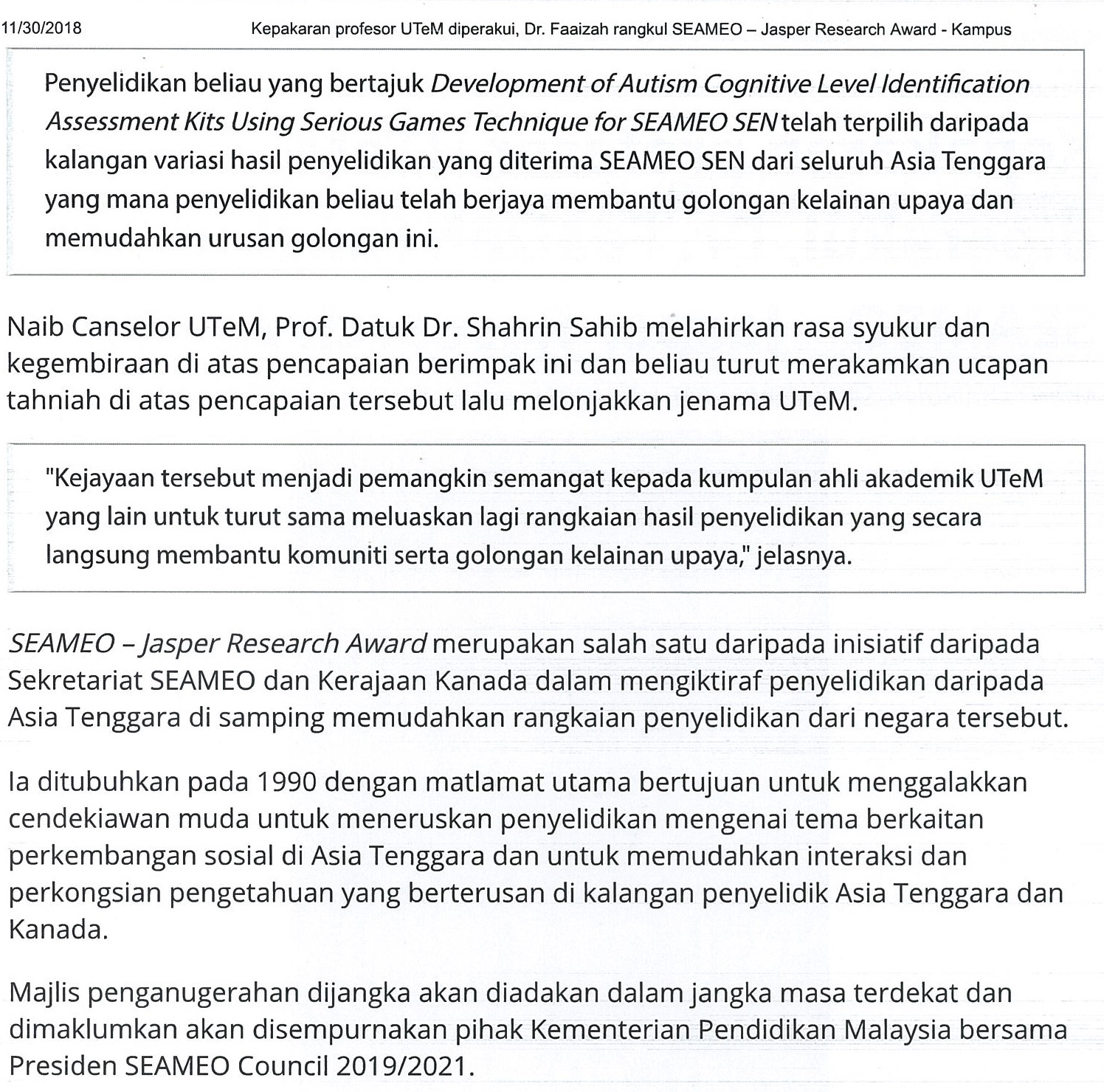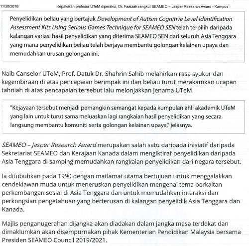 Kepakaran profesor UTeM diperakui, Dr. Faaizah rangkul SAEMEO - Jasper Research Award (part2)