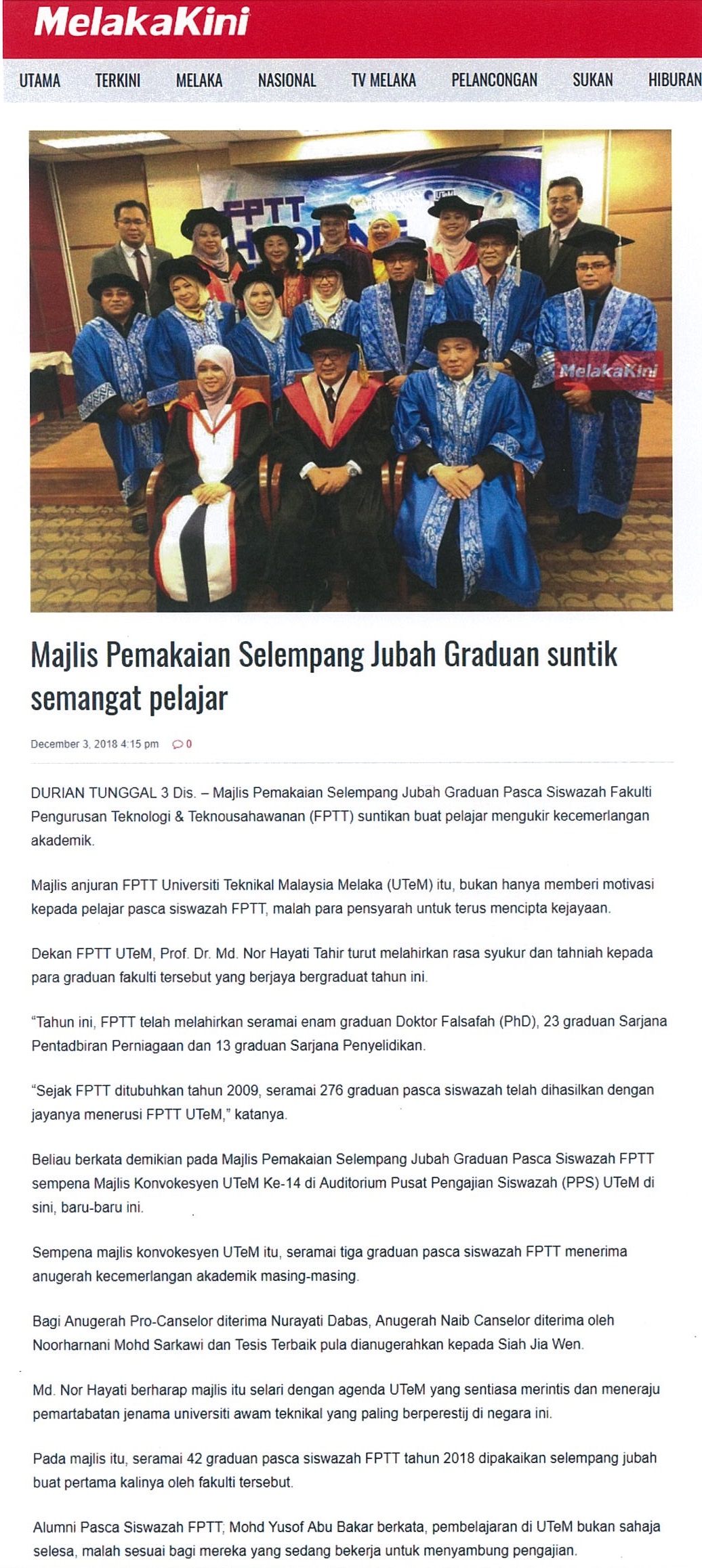 Pemakaian selempang jubah graduan pasca siswazah FPTT UTeM sunik semangat kecemerlangan akademik