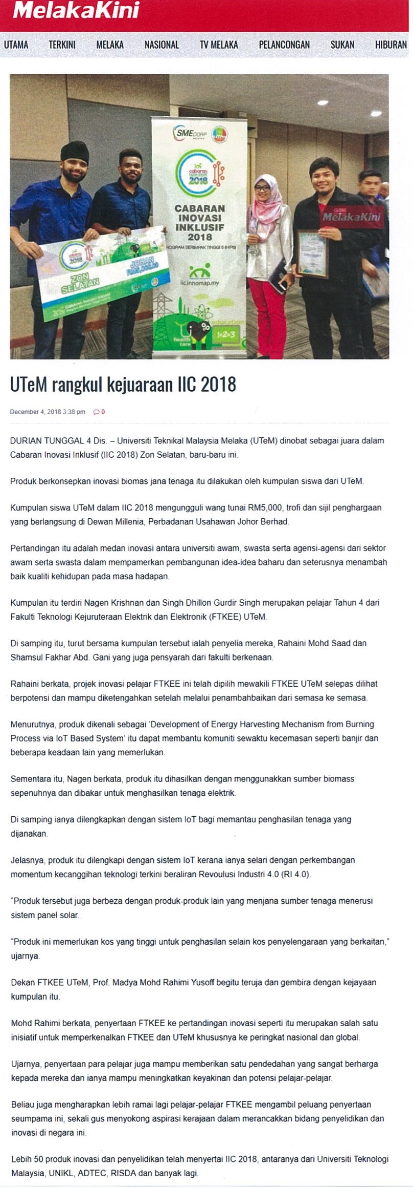 UTeM rangkul kejuaraan IIC 2018