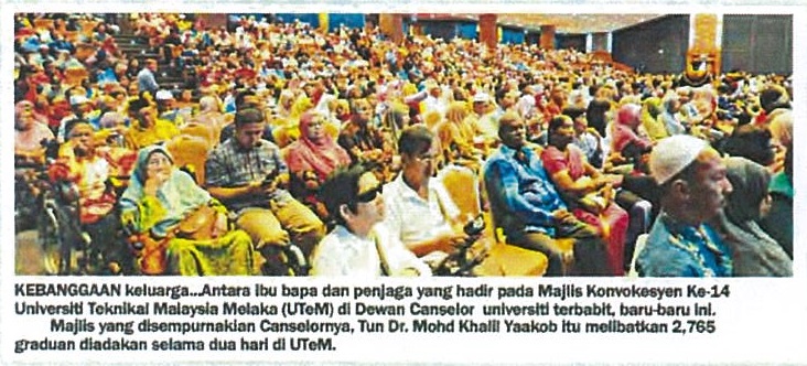 : | Antara ibu bapa dan penjaga yang hadir di Majlis Konvokesyen ke-14 UTeM di Dewan Canselor universiti terbabit, baru-baru ini. Majlis yang disempurnakan Canselornya, Tun Dr. Mohd Khalil Yaakob itu melibatkan 2765 graduan diadakan selama dua hari di UTeM. |
