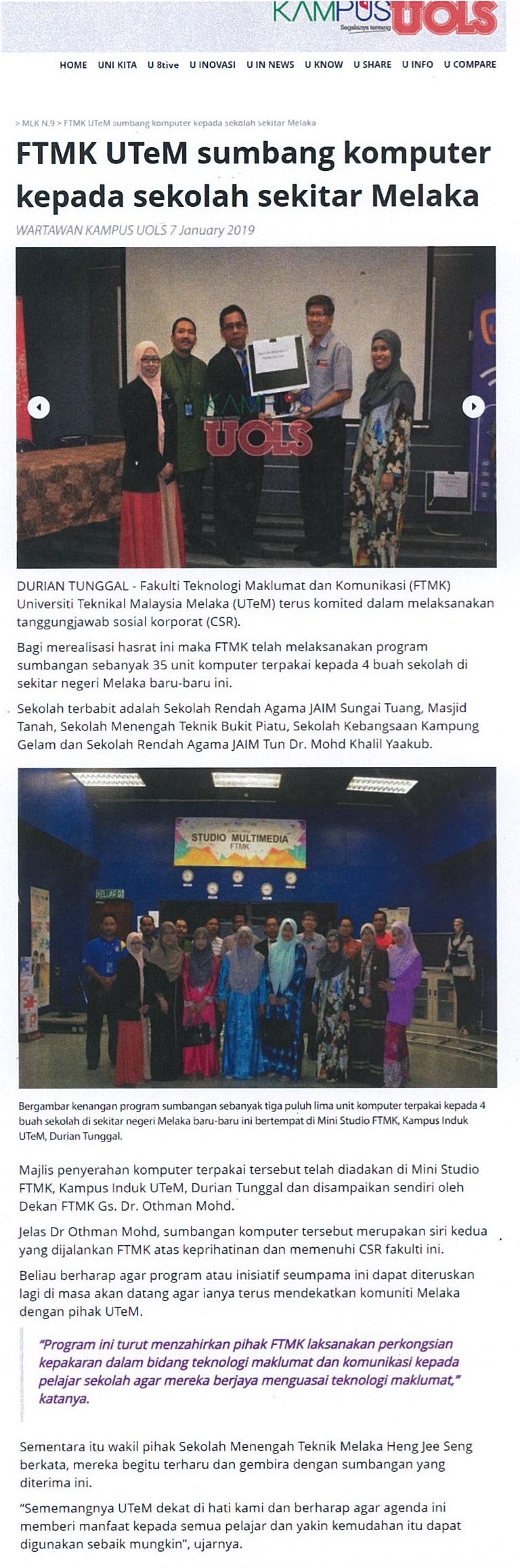 FTMK UTeM sumbang komputer kepada sekolah sekitar Melaka