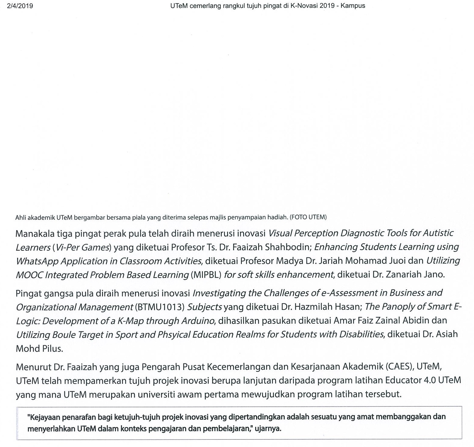 UTeM cemerlang rangkul tujuh pingat di K-Novasi 2019 (part2)