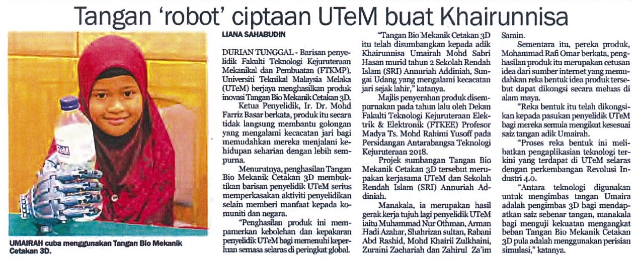 Tangan 'robot' ciptaan UTeM buat Khairunnisa