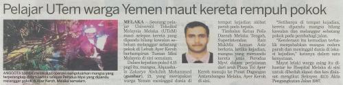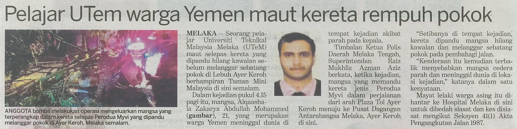 Pelajar UTeM warga Yemen maut kereta rempuh pokok