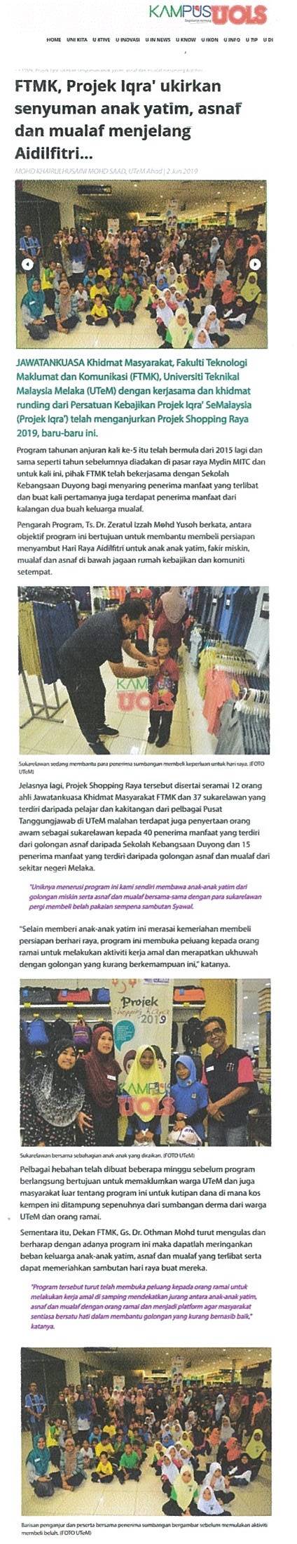 FTMK, Projek Iqra ukirkan senyuman anak yatim, asnaf dan mualaf menjelang Aidilfitri