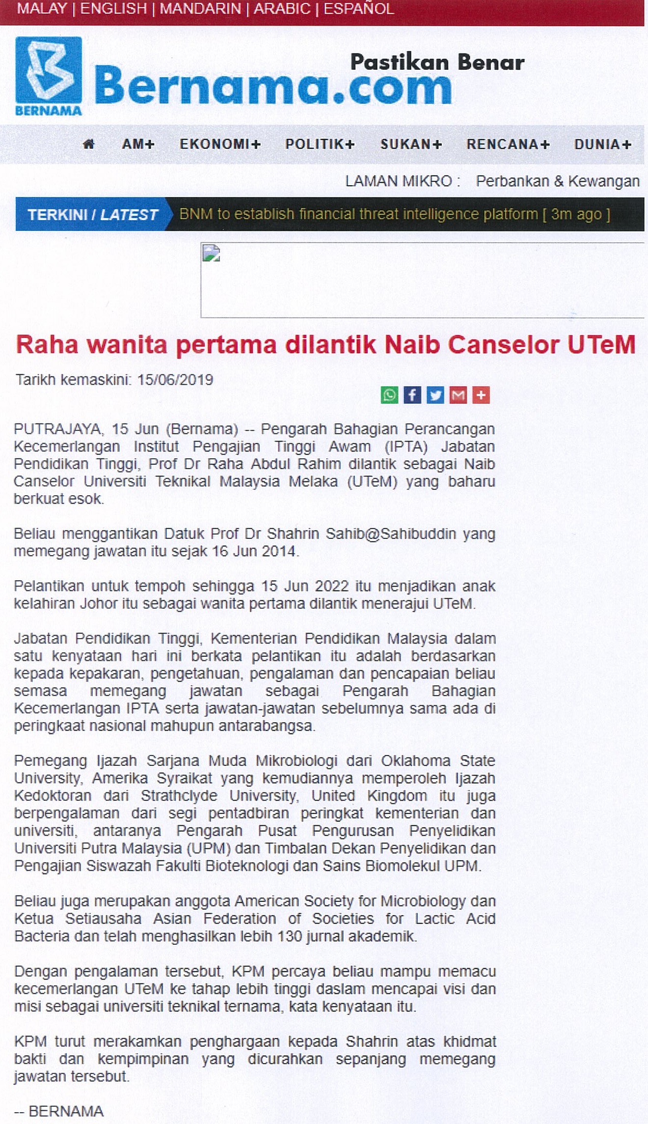 Raha wanita pertama dilantik Naib Canselor UTeM