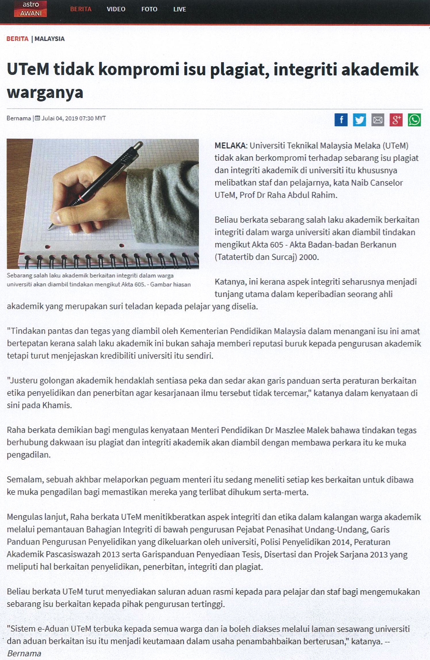 UTeM tidak kompromi isu palgiat, integriti akademik warganya