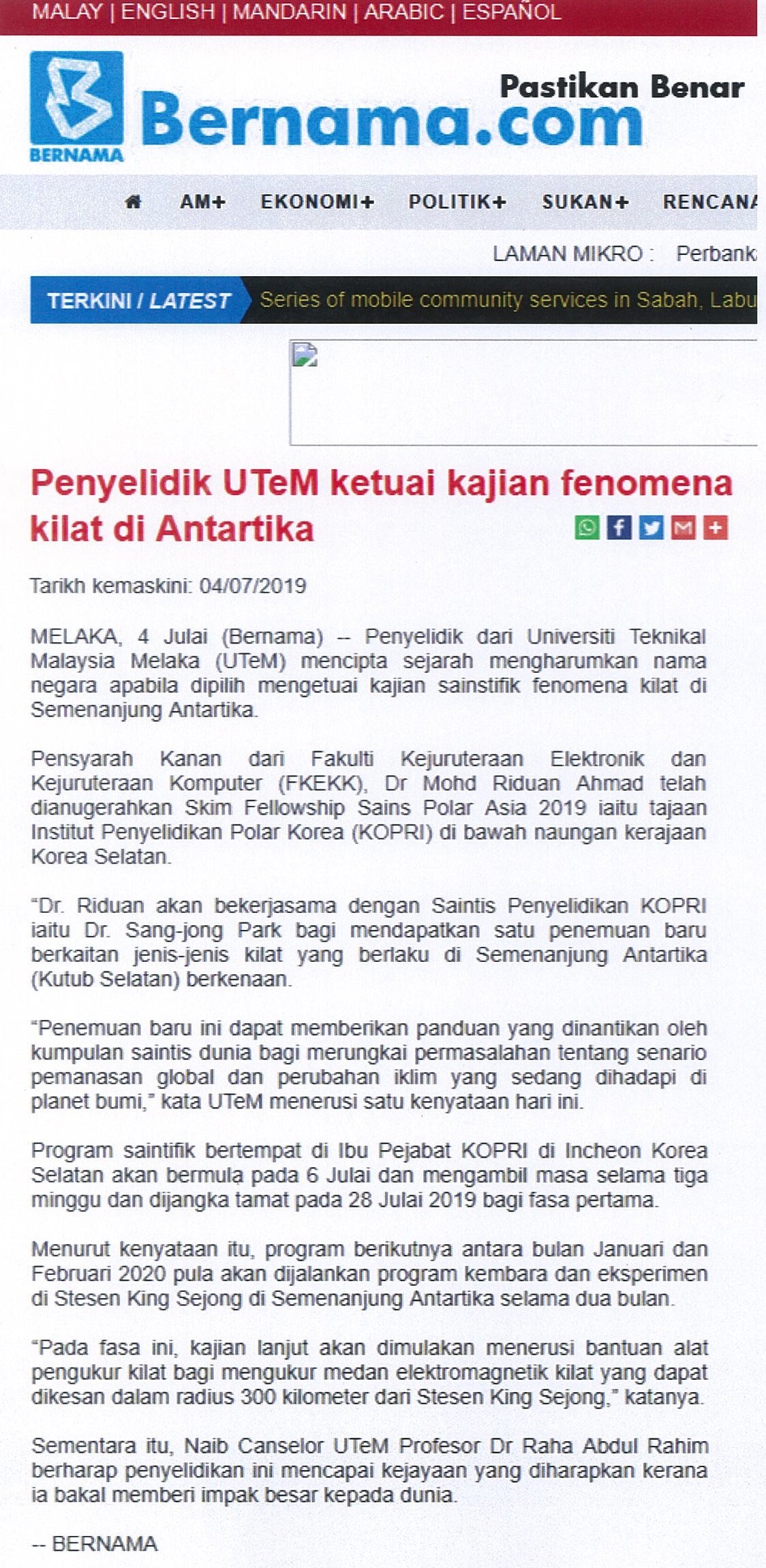 Penyelidik UTeM ketuai kajian fenomena kilat di Antartika