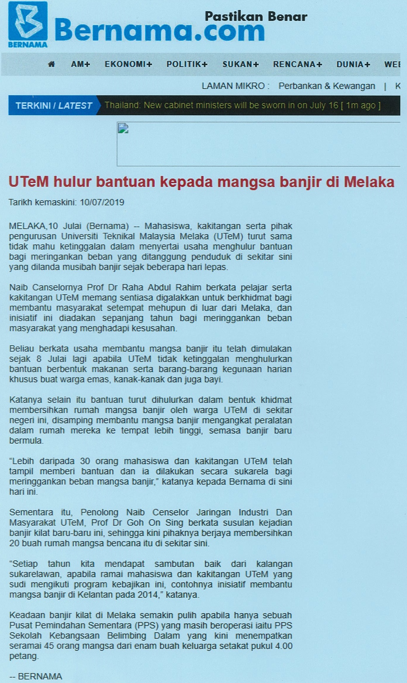 UTeM hulur bantuan kepada mangsa banjir di Melaka