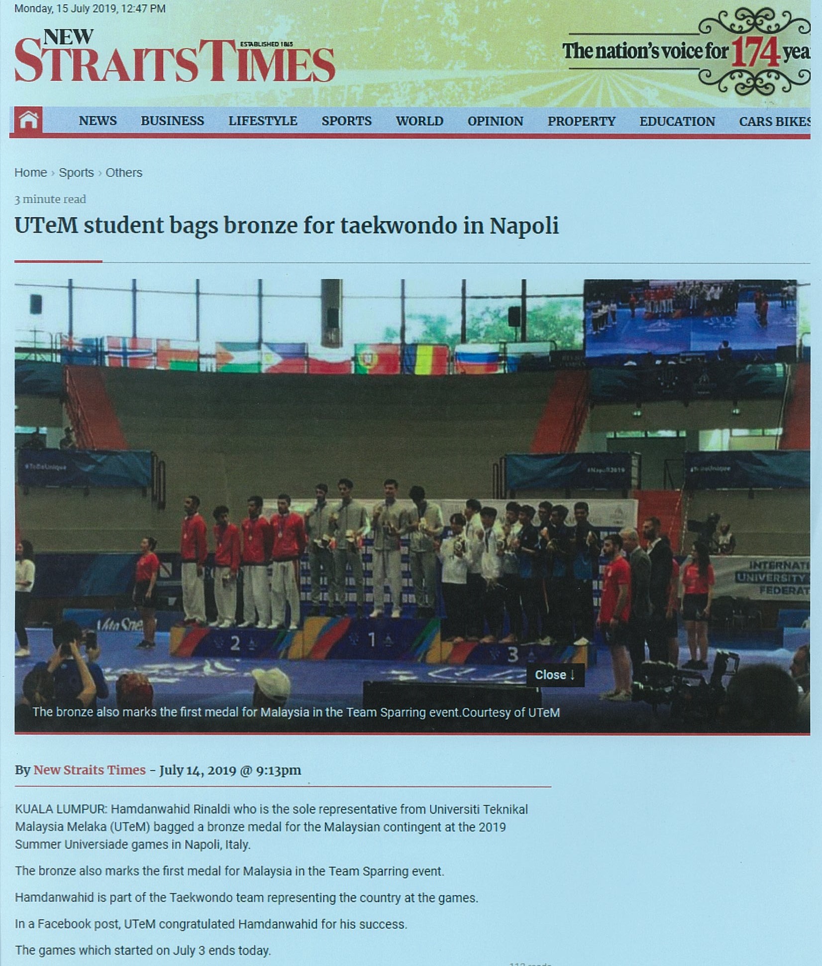 UTeM student bags bronze for taekwando in Napoli