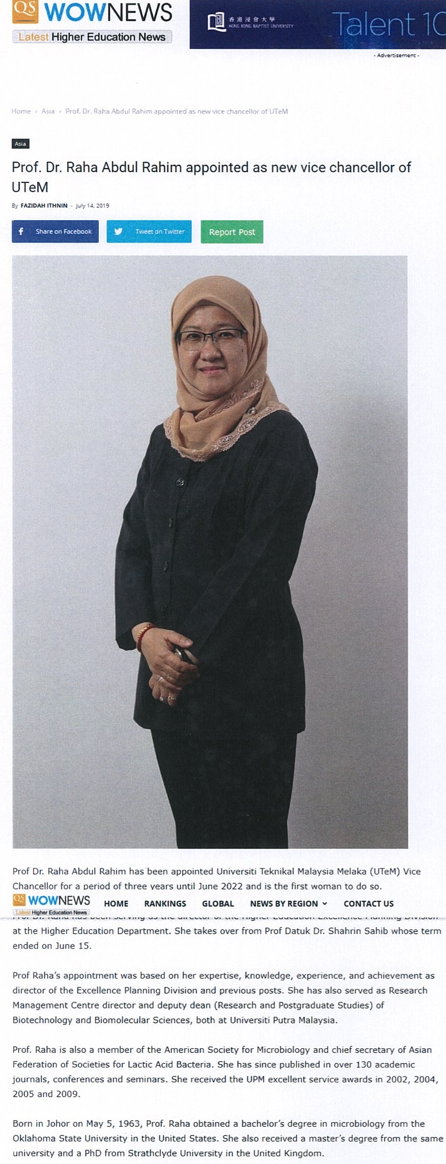 Prof. Dr. Raha Abdul Rahim appointed as new vice chancellor of UTeM