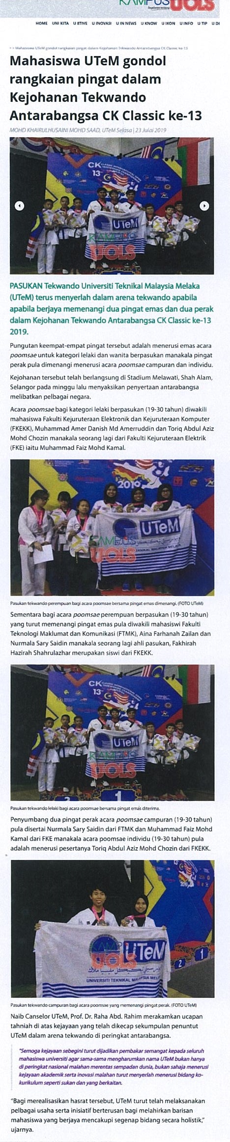 Mahasiswa UTeM gondol rangkaian pingat dalam kejohanan taekwando antarabangsa CK classic ke-13