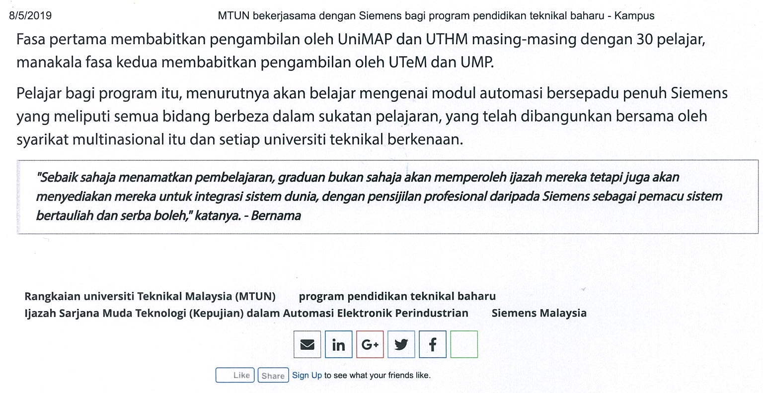 MTUN bekerjasama dengan Siemens bagi program pendidikan teknikal baharu (part2)