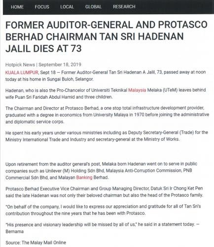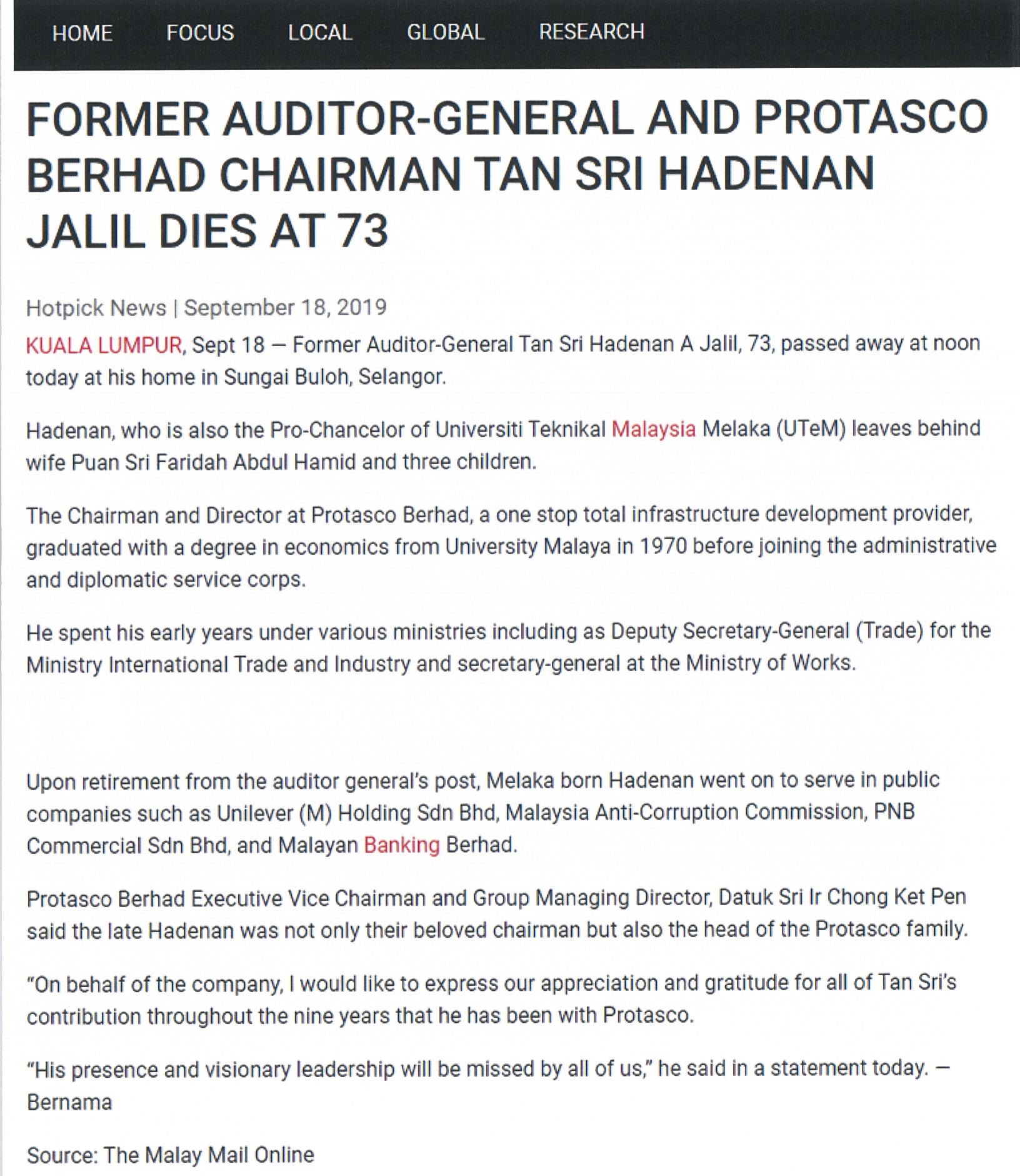 Former auditor-general and Protasco Berhad chairman Tan Sri Dr Hadenan Jalil dies at 73