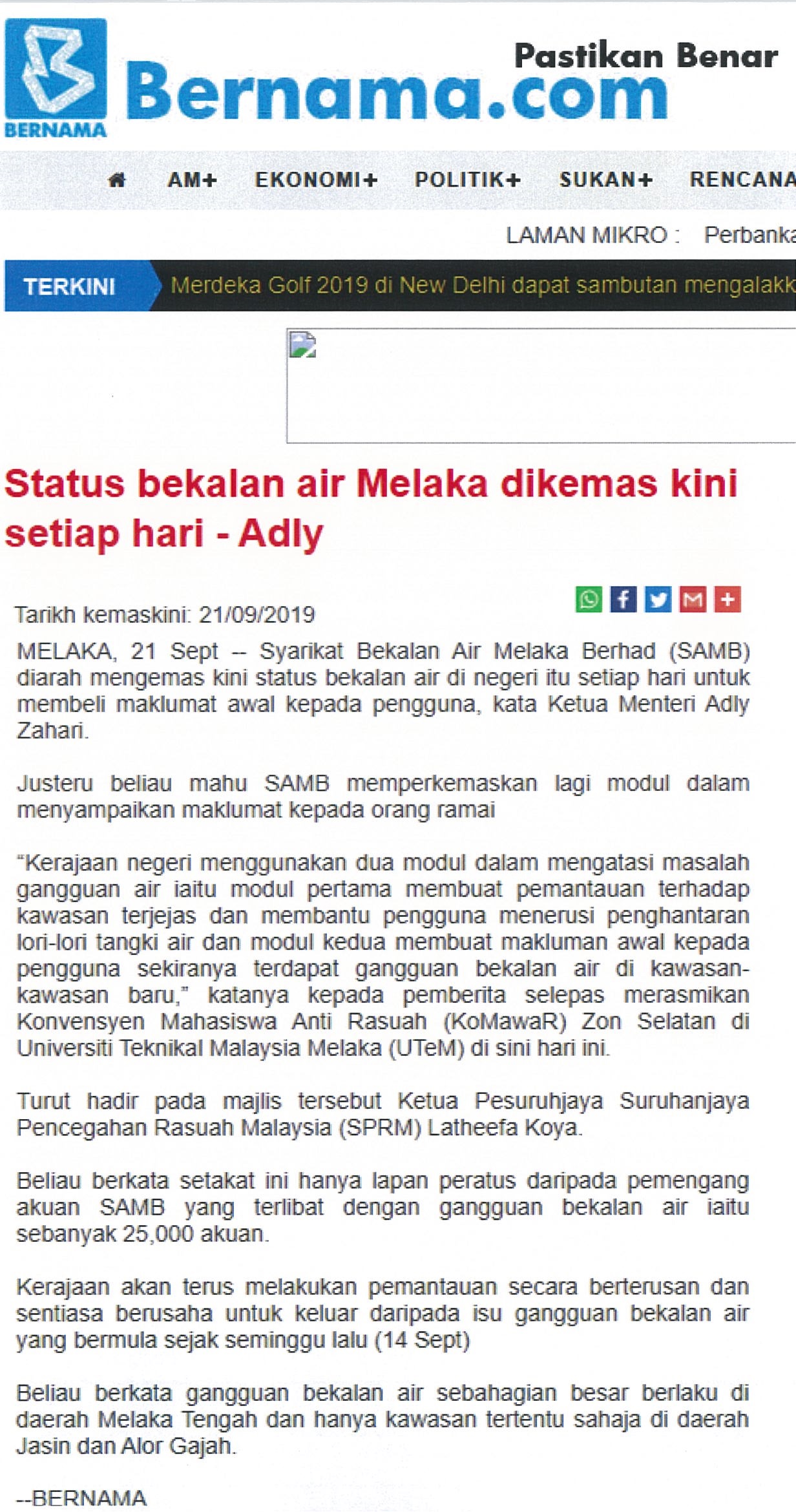 Status bekalan air Melaka dikemaskini setiap hari : Adly