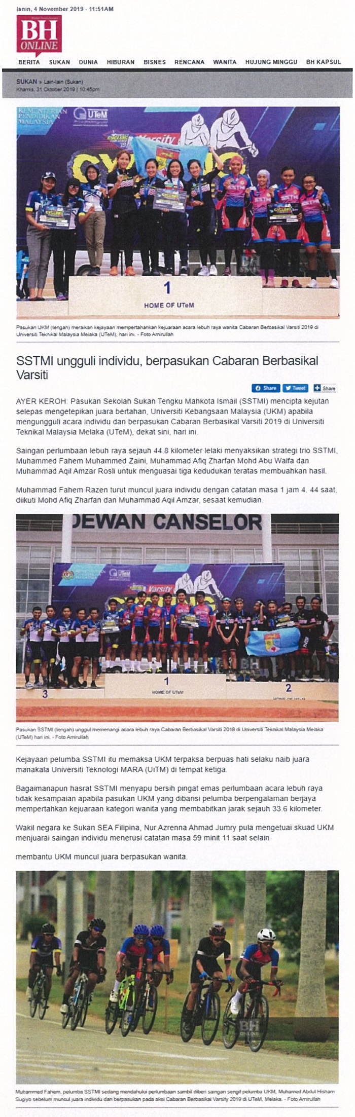 SSTMI ungguli individu, berpasukanCbaran Berbasikal Varsiti