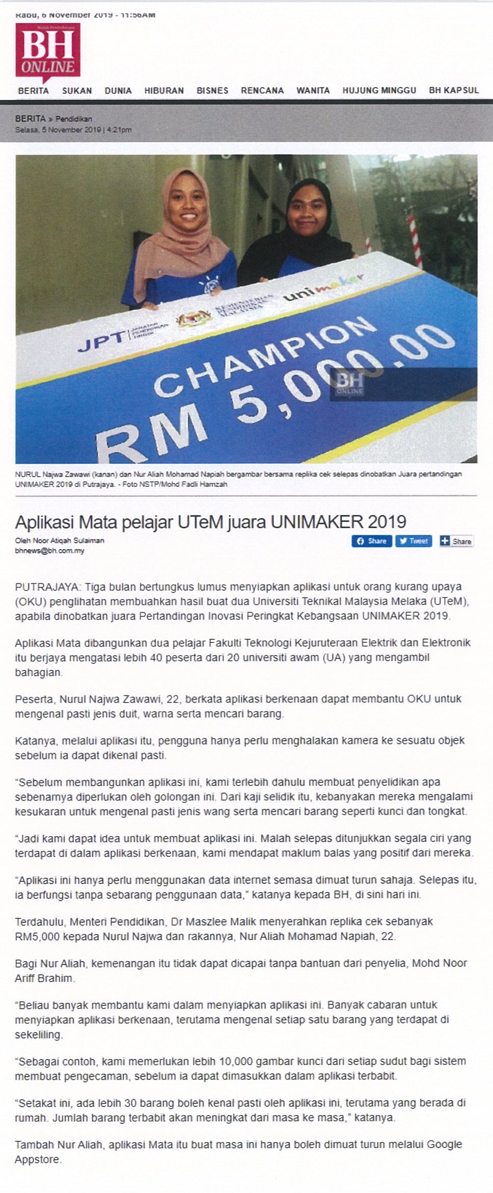 Aplikasi mata pelajar UTeM juara UNIMAKER 2019