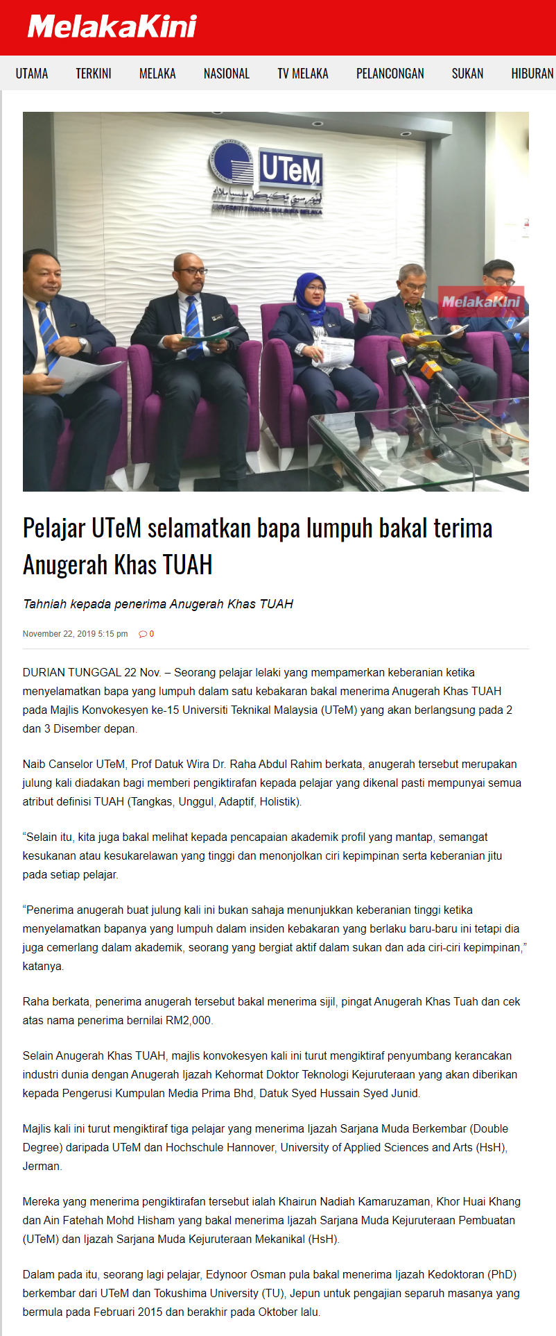 Pelajar UTeM selamatkan bapa lumpuh bakal terima Anugerah Khas TUAH