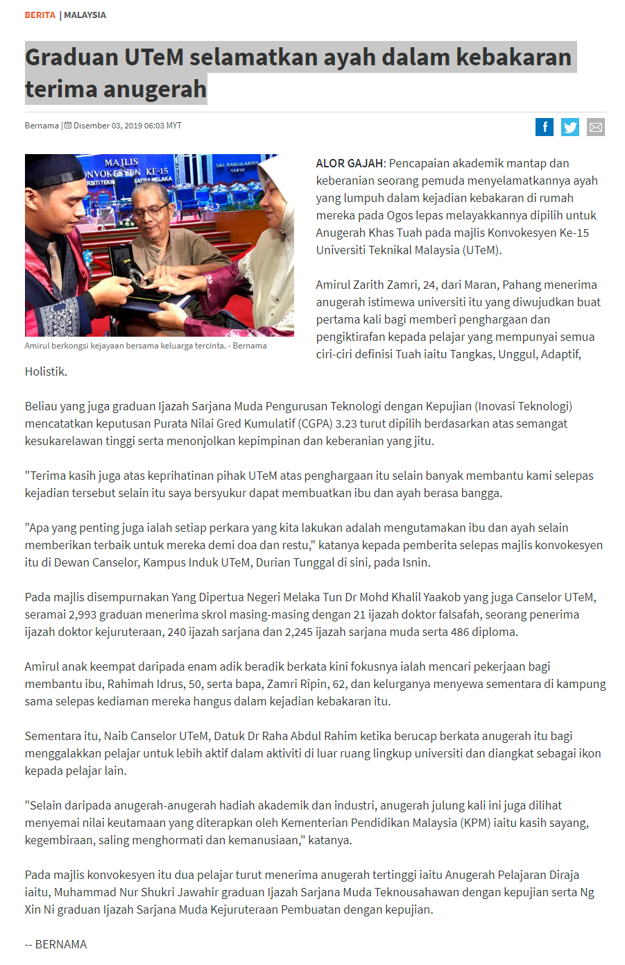 Graduan UTeM selamatkan ayah dalam kebakaran terima anugerah