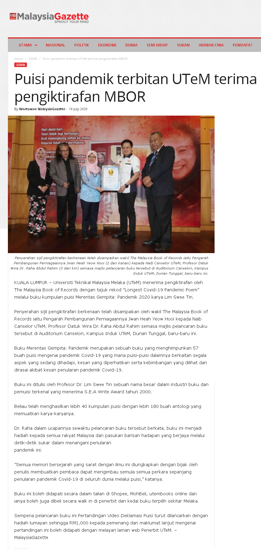 Puisi pandemik terbitan UTeM terima pengiktirafan MBOR