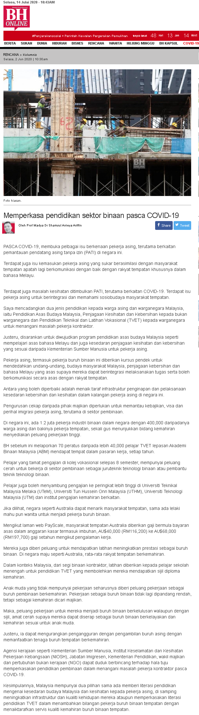 Memperkasa pendidikan sektor binaan pasca COVID-19