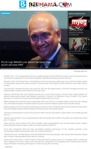 PLUS rugi RM400 juta dalam tempoh tiga bulan semasa PKP