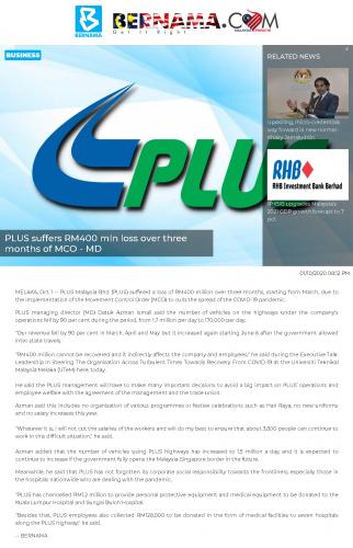 PLUS suffers RM400 mln loss over three months of MCO - MD