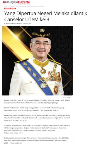 Yang Dipertua Negeri Melaka dilantik Canselor UTeM ke-3