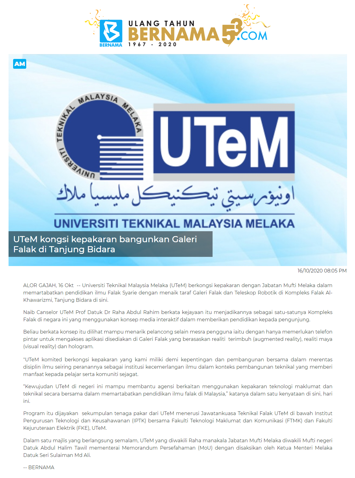 UTeM kongsi kepakaran bangunkan Galeri Falak di Tanjung Bidara
