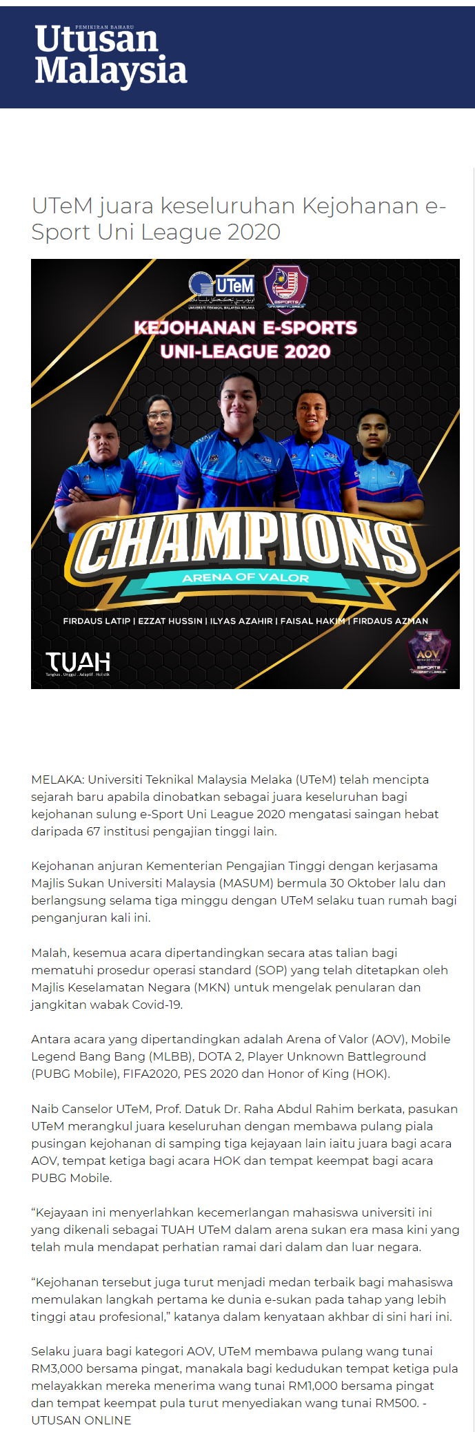 UTeM juara keseluruhan Kejohanan e-Sport Uni League 2020
