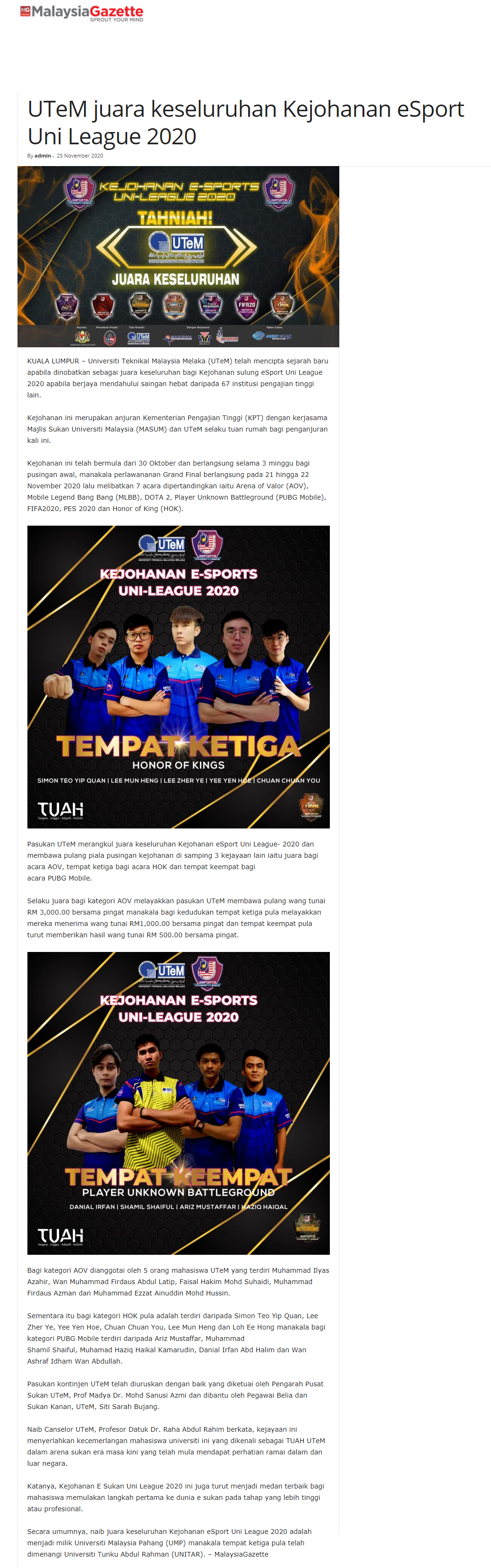 UTeM juara keseluruhan Kejohanan eSport Uni League 2020