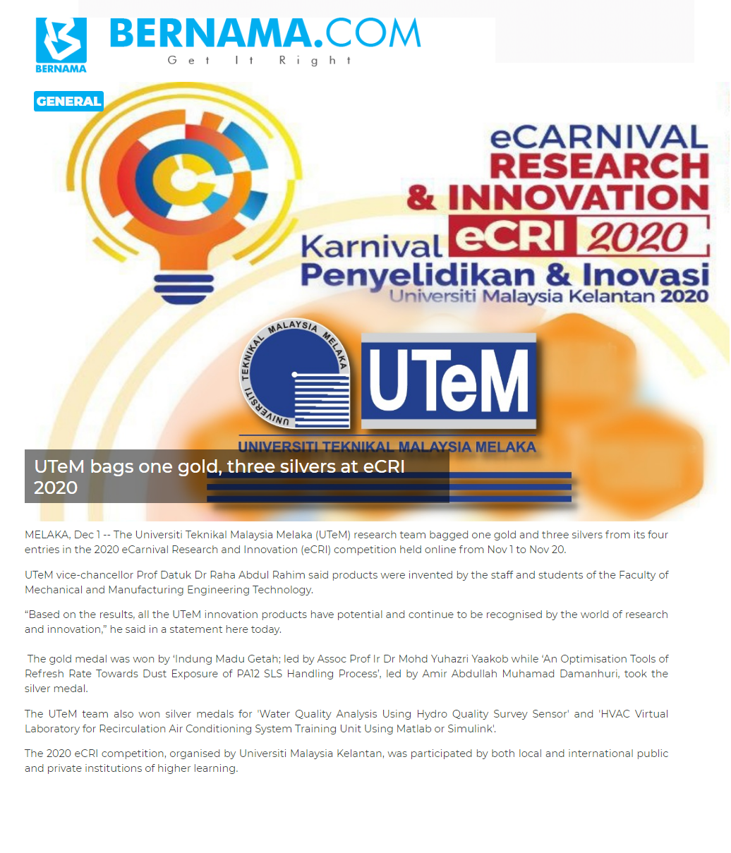 UTeM bags one gold, three silvers at eCRI 2020