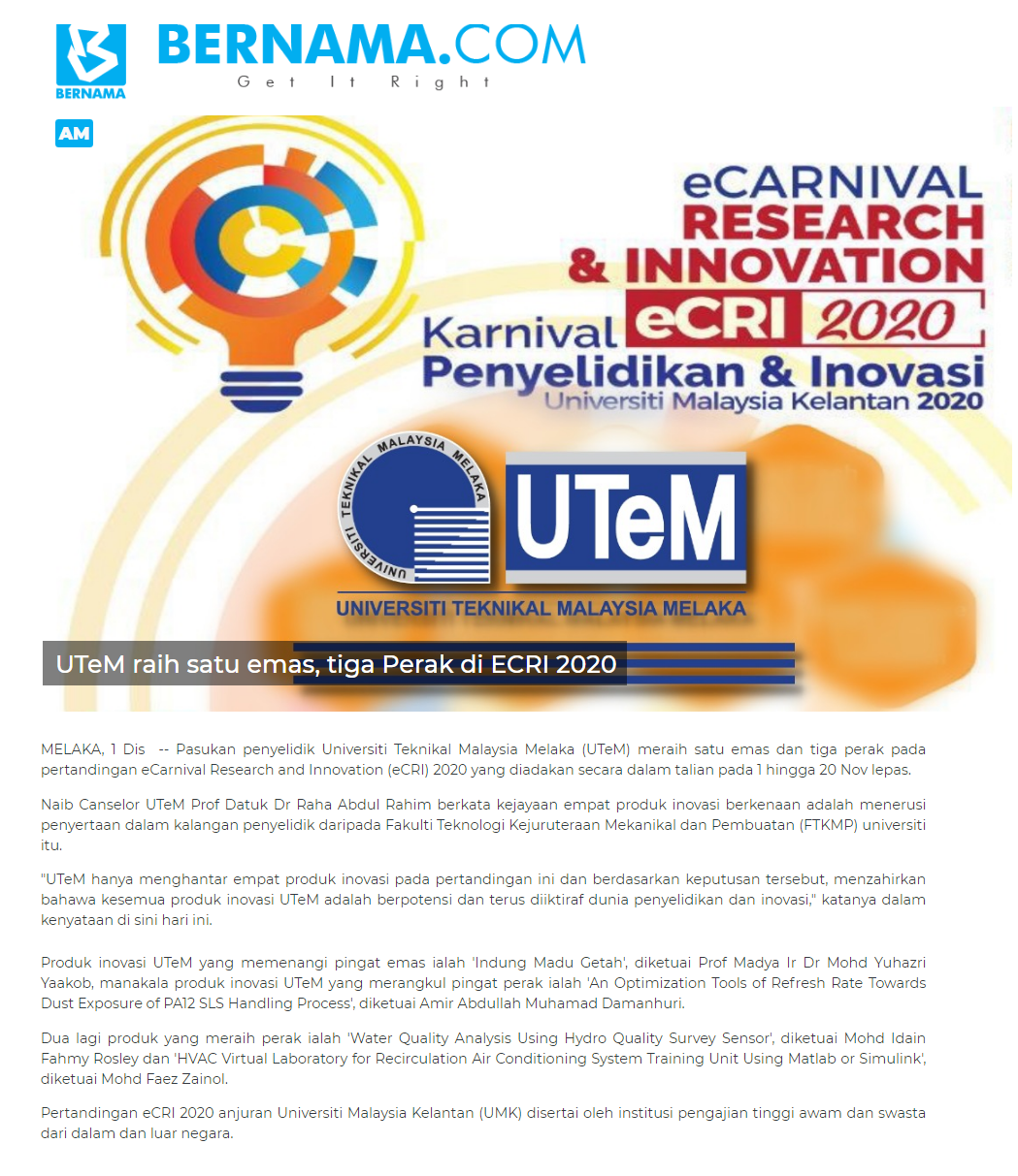 UTeM raih satu emas, tiga Perak di ECRI 2020