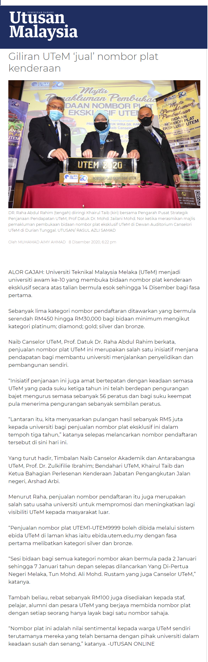 Giliran UTeM ‘jual’ nombor plat kenderaan
