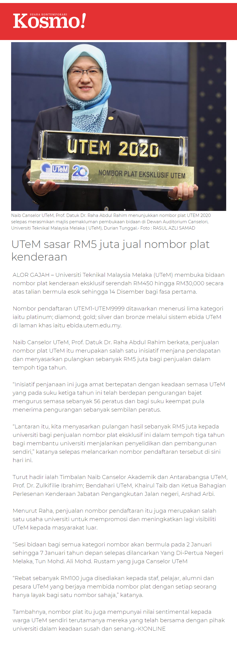 UTeM sasar RM5 juta jual nombor plat kenderaan