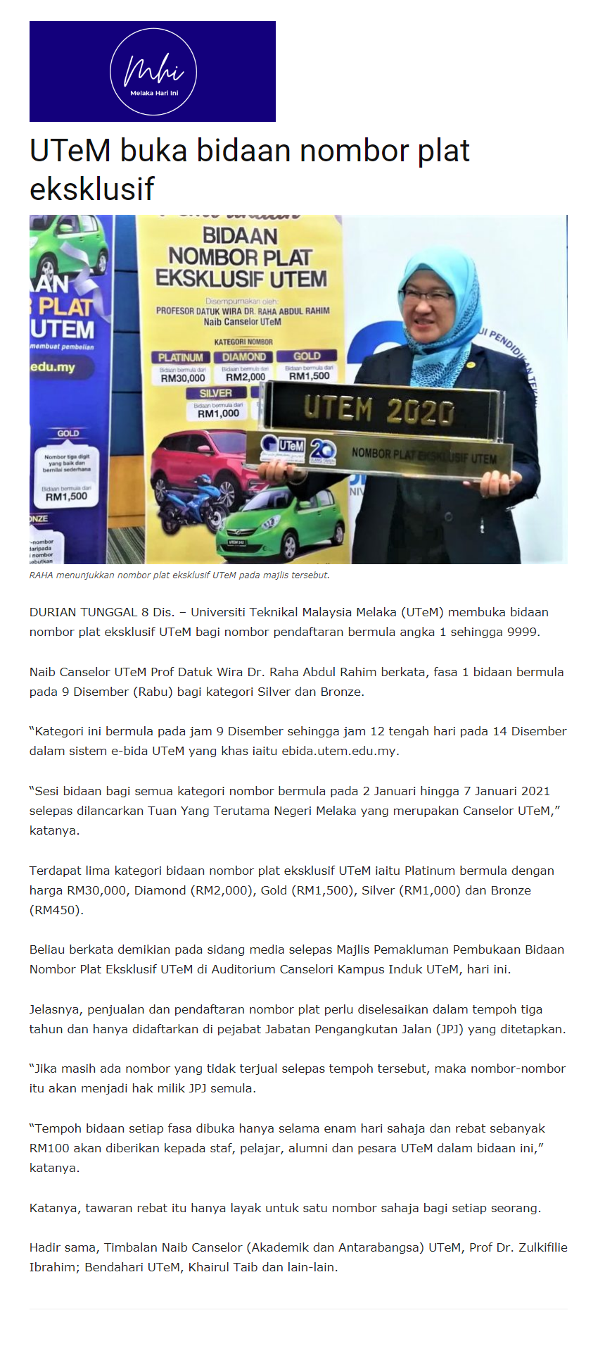 UTeM buka bidaan nombor plat eksklusif