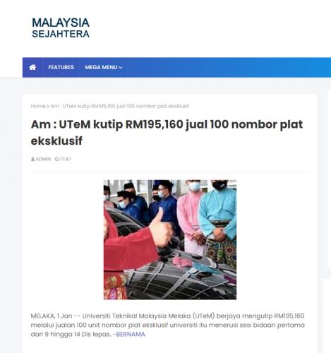 UTeM kutip RM195,160 jual 100 nombor plat eksklusif