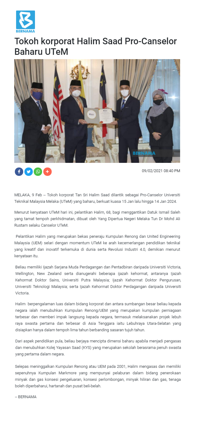 Tokoh korporat Halim Saad Pro-Canselor Baharu UTeM