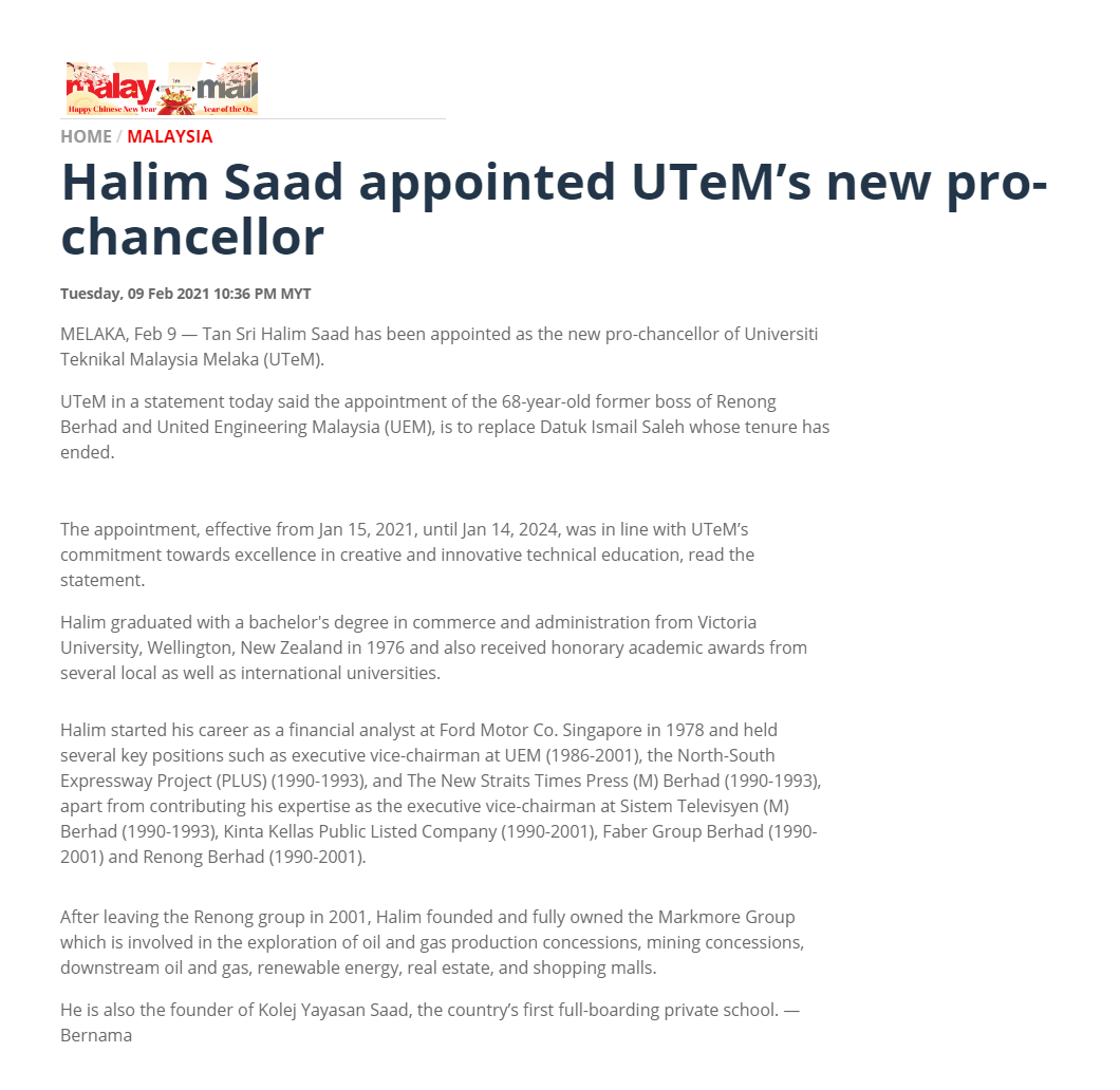 Halim Saad appointed UTeM’s new pro-chancellor