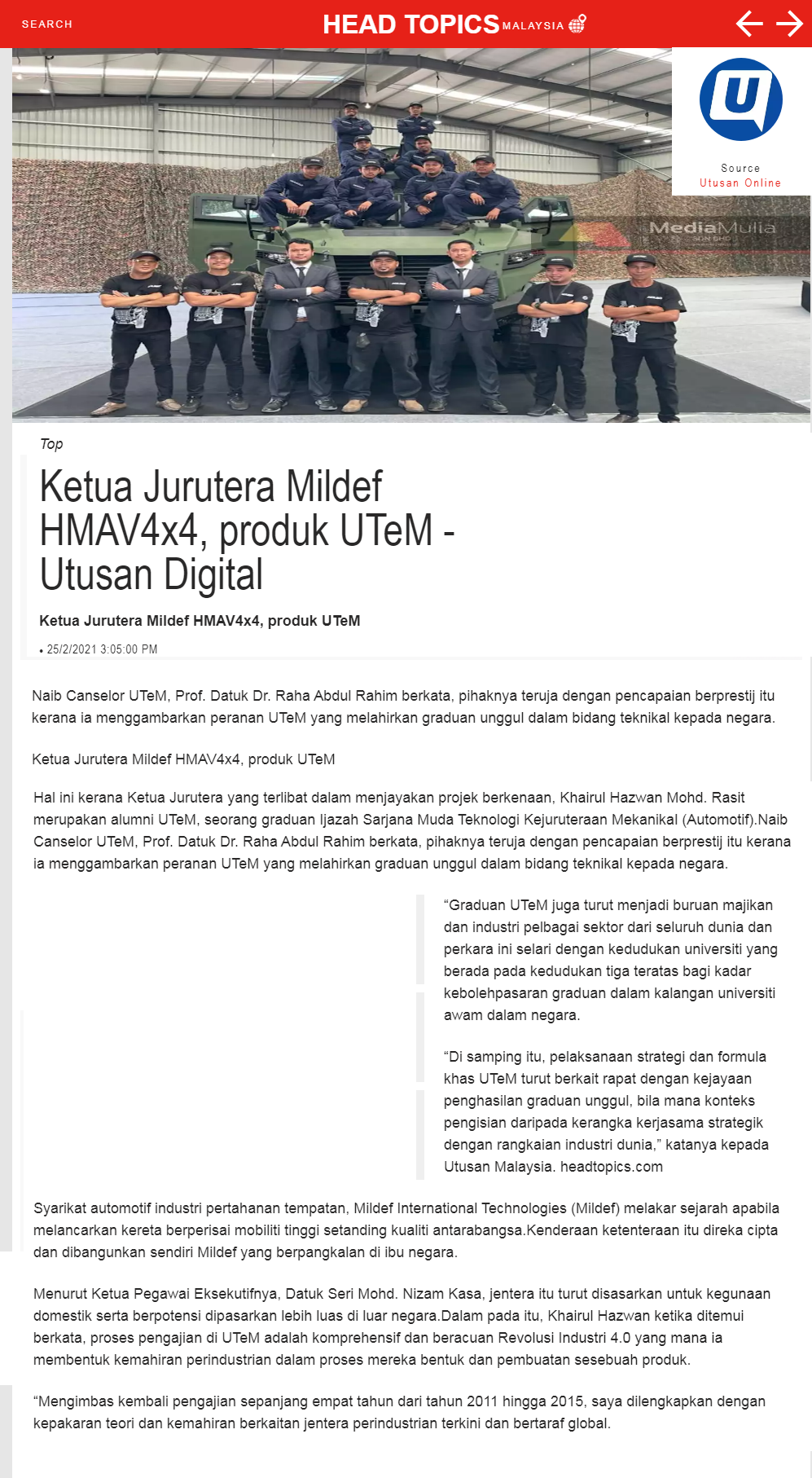 Ketua Jurutera Mildef HMAV4x4, produk UTeM
