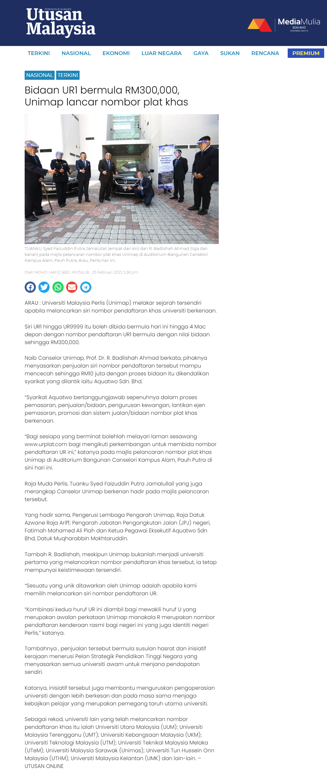 Bidaan UR1 bermula RM300,000, Unimap lancar nombor plat khas