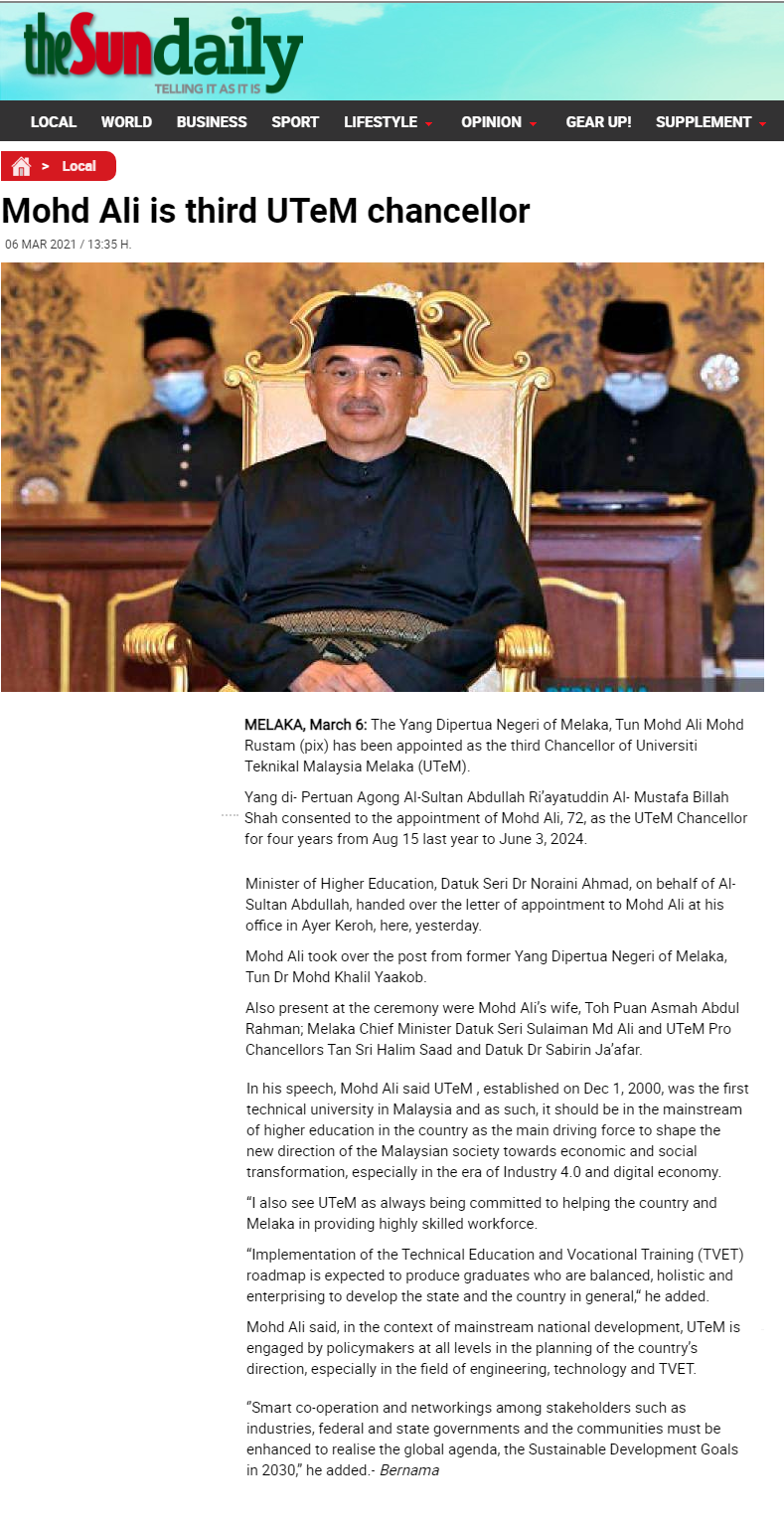 Mohd Ali is third UTeM chancellor